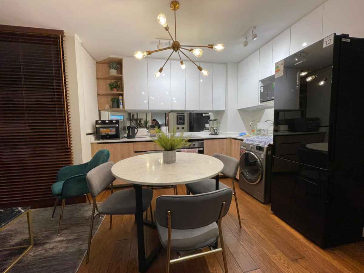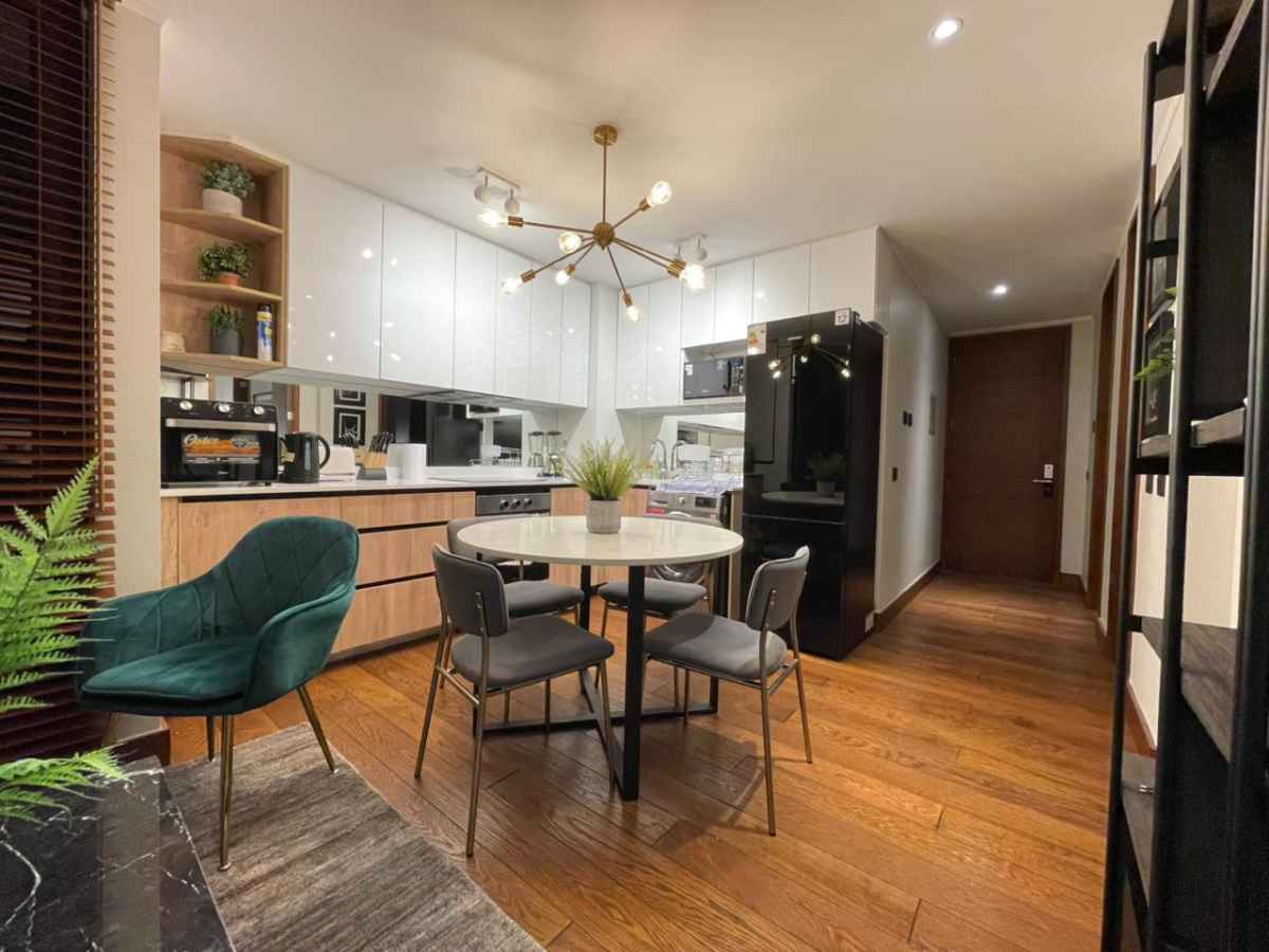 • Cocina tipo americana full equipada, encimera, horno eléctrico, microondas y refrigerador